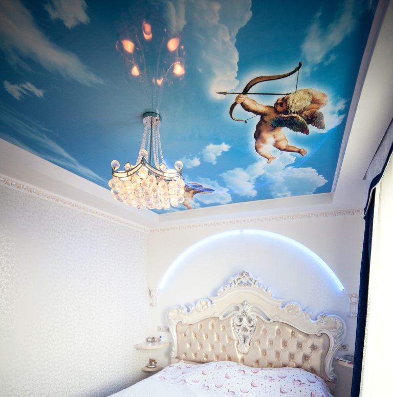 Потолок с рисунком – это отличная возможность сделать интерьер уникальным. Украсить полотно можно абсолютно любым узором – от стандартного неба и абстрактных фигур до всевозможных животных, мультяшных героев и городских пейзажей. Также, интересным вариантом являются натяжные потолки-картины. На таких полотнах можно увидеть настоящие произведения искусства.