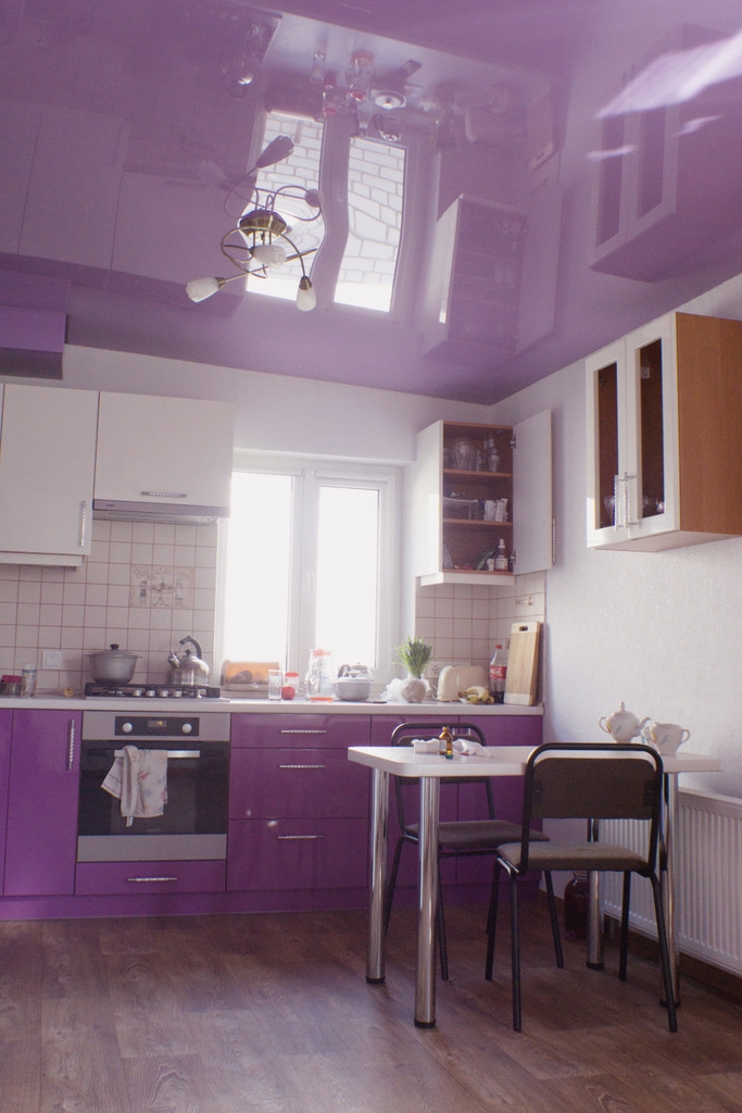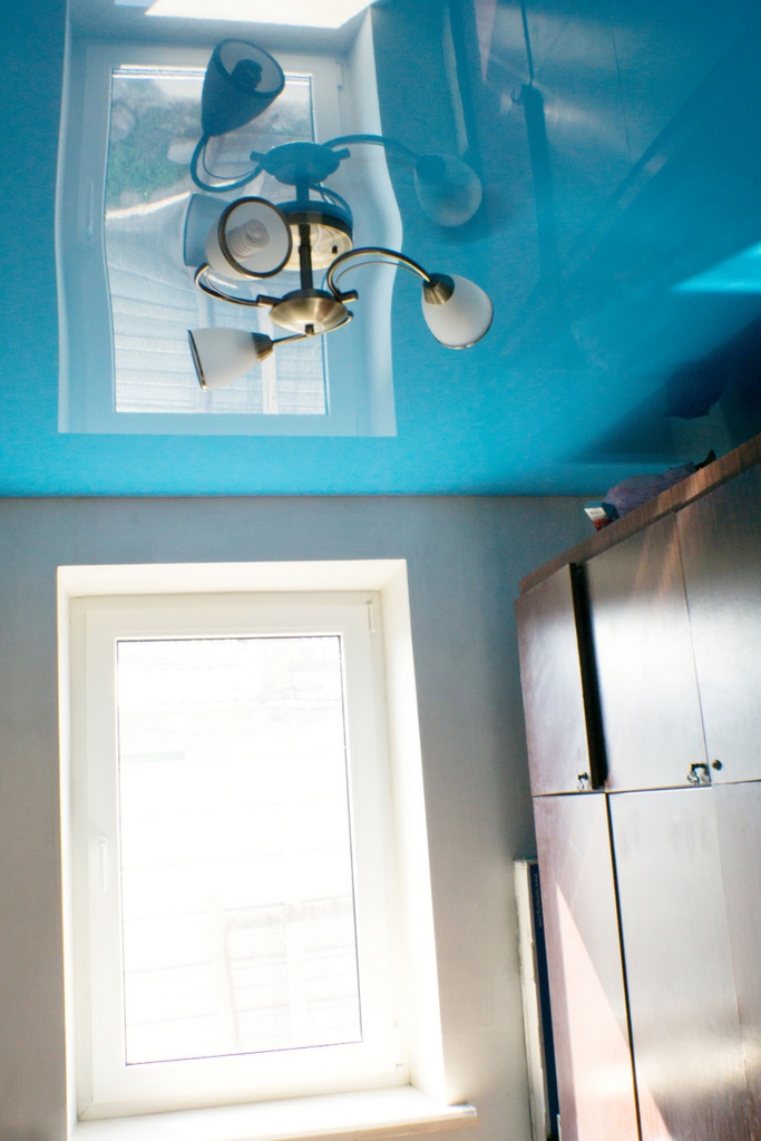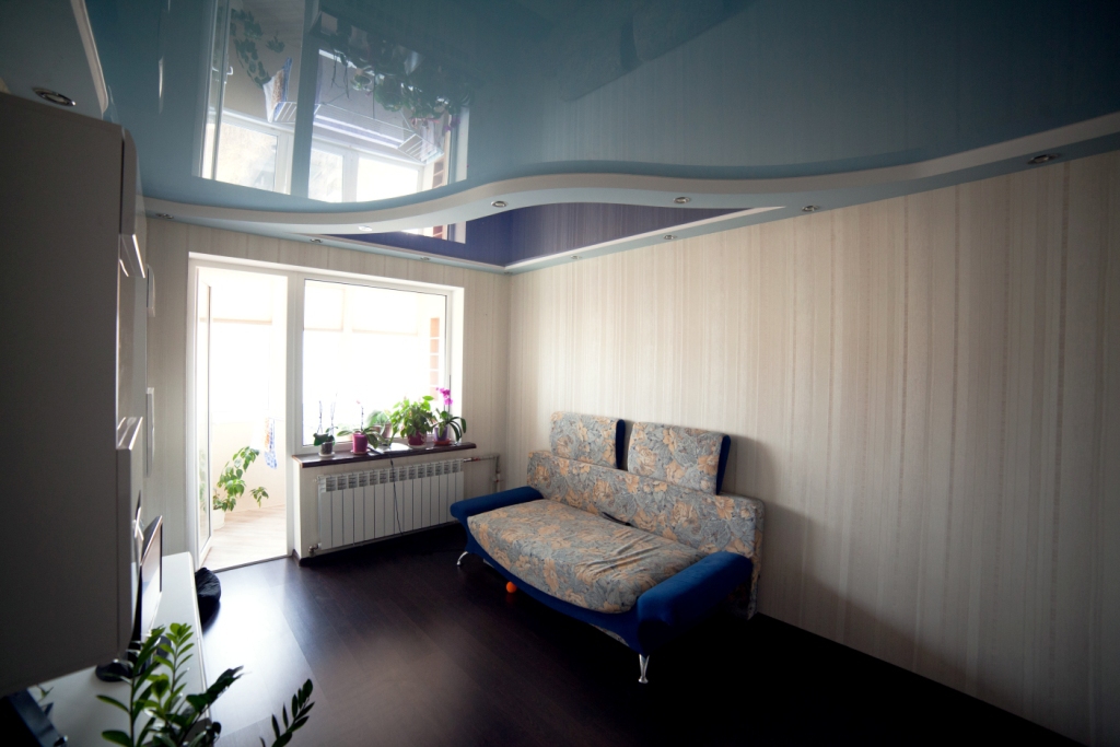 Глянцевые полотна делают комнату визуально светлее и просторнее. Смотрите, как смотрится глянцевы натяжно потолок фото: кухня, зал, спальня, детская. Они имеют зеркальную поверхность, на которой отражается все, что находится в помещении. Поэтому если вы хотите зрительно поднять потолок, такое покрытие станет удачным решением.