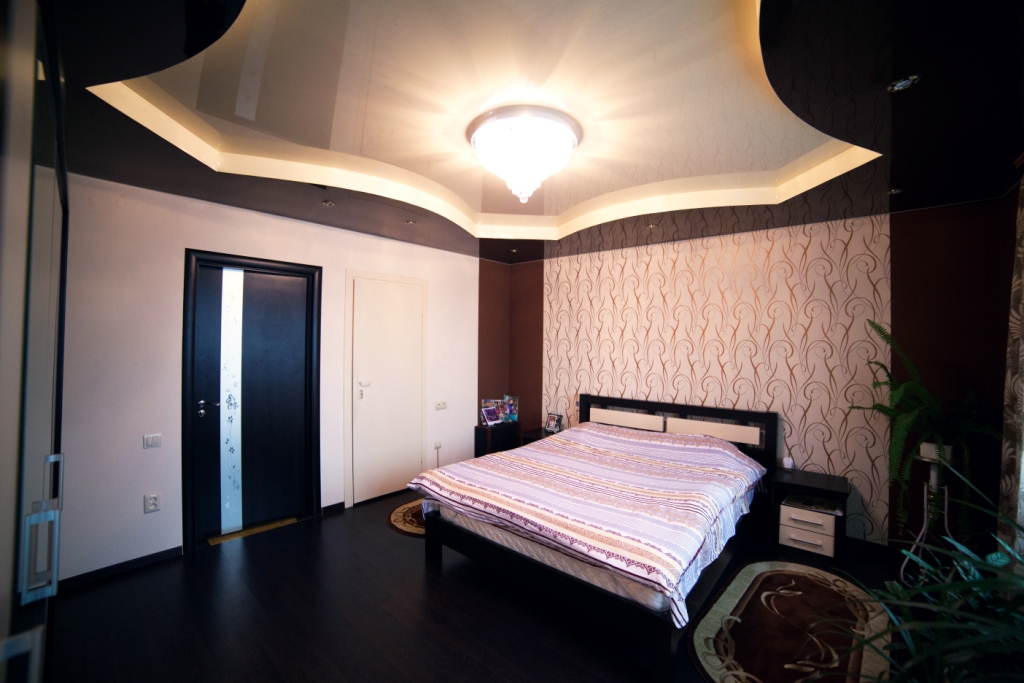 Поскольку спальня предназначена для отдыха и сна, оформление в комнате следует делать ненавязчивым. Можно установить матовый или сатиновый потолок (фото в интерьере поможет вам определиться с выбором). Рекомендуется использовать нежные оттенки, но если вы хотите добавить немного красок, подойдут полотна с небольшим рисунком, комбинации светлых и ярких покрытий, а также конструкции «Звездное небо».