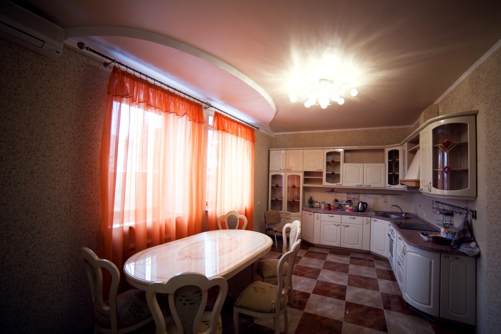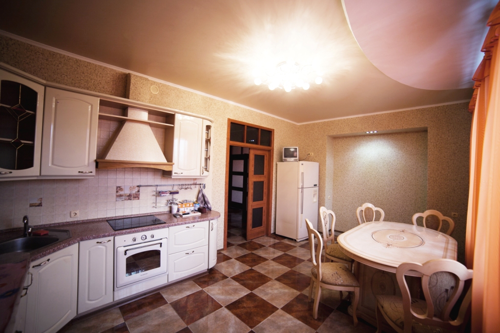 Для большой комнаты можно выбрать двухуровневый потолок, поскольку таким образом удастся разделить пространство на разные участки – рабочую зону, место для отдыха и приема еды. А для небольшой кухни больше подойдут простые полотна светлых оттенков.
