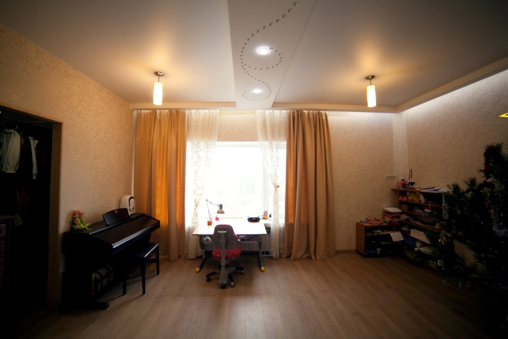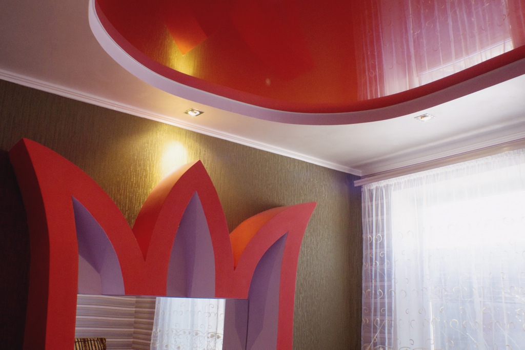 Детская – эта та комната, где можно отпустить фантазию на свободу. Для оформления подойдут двухцветные одноуровневые потолки, яркие краски, полотна с рисунком и необычная подсветка. Умело комбинируя разные по цвету и фактуре покрытия, а также создавая интересные формы, вы получите уникальный дизайн.