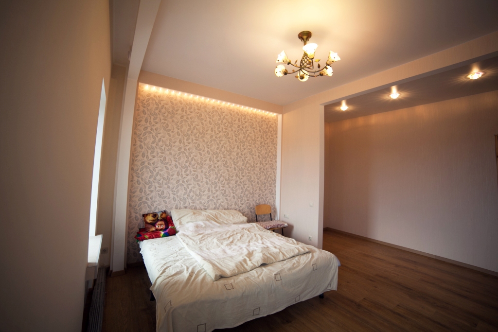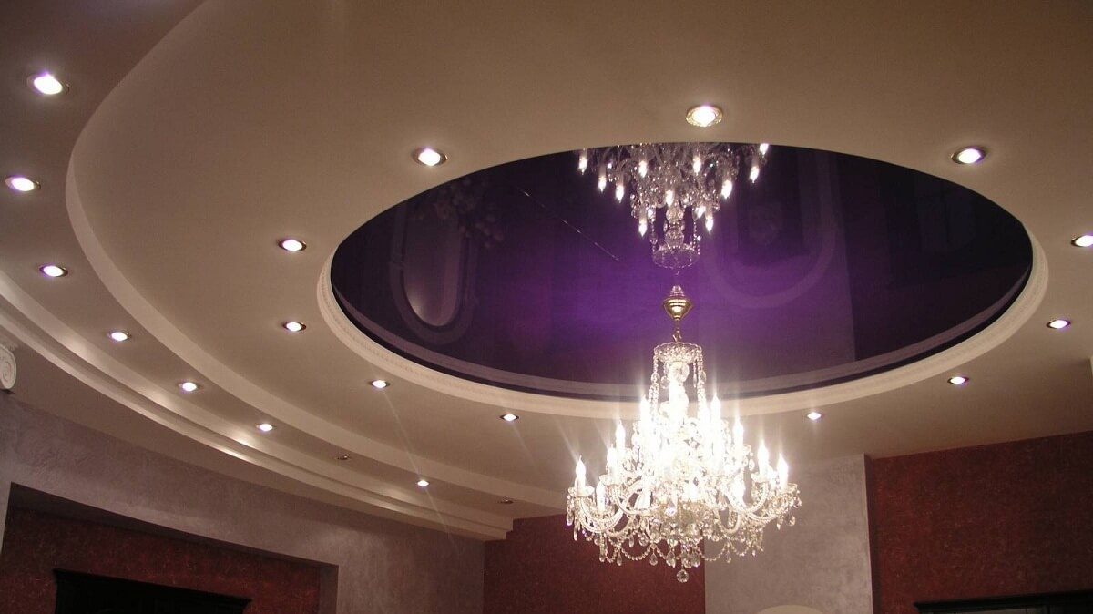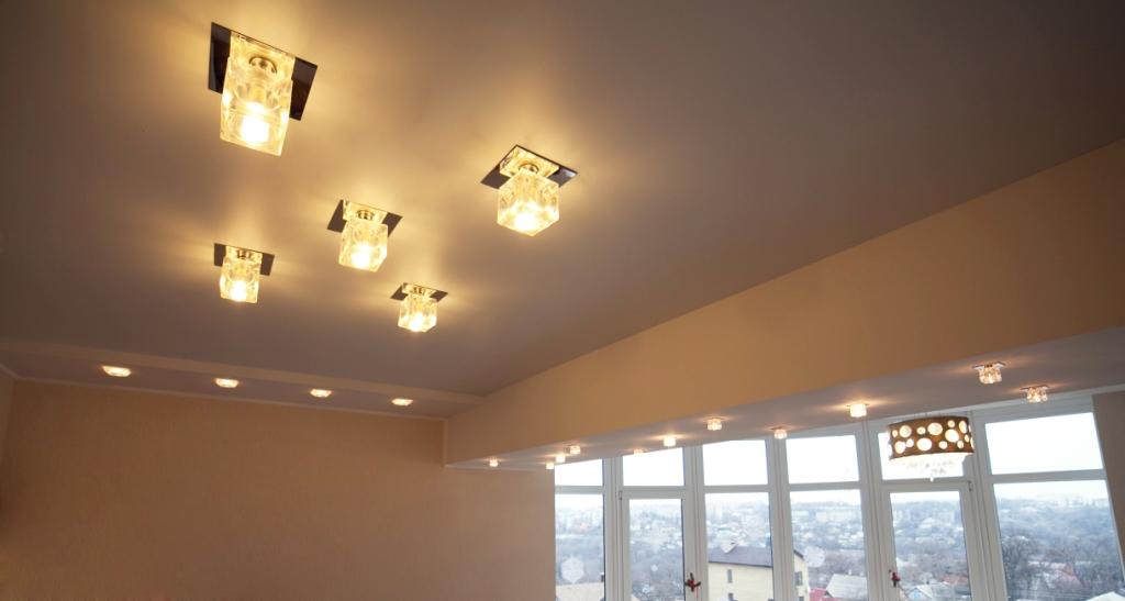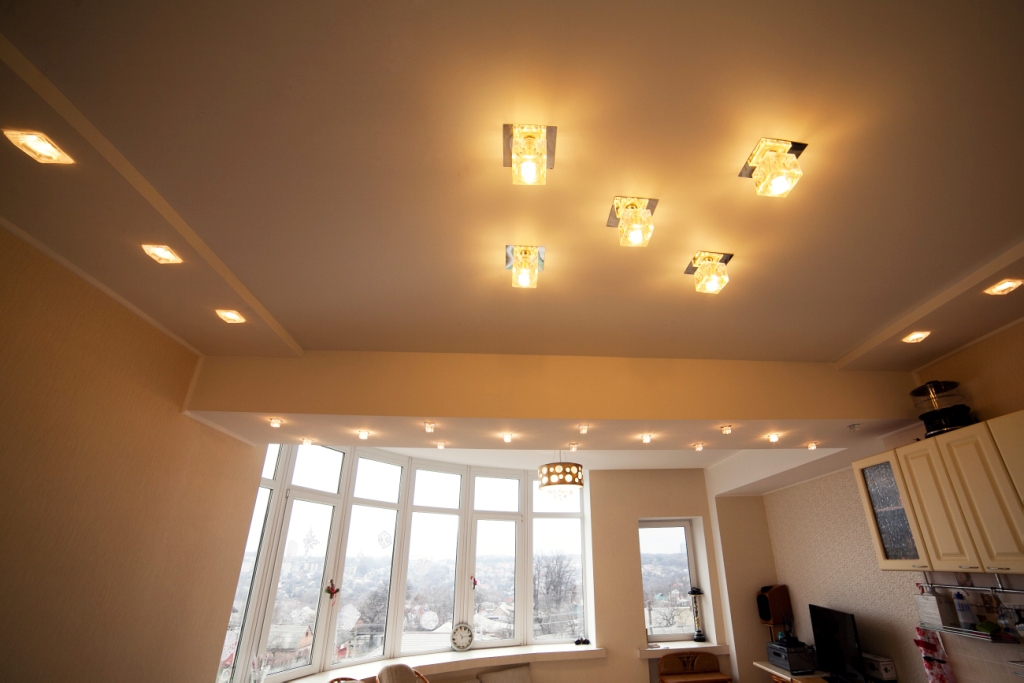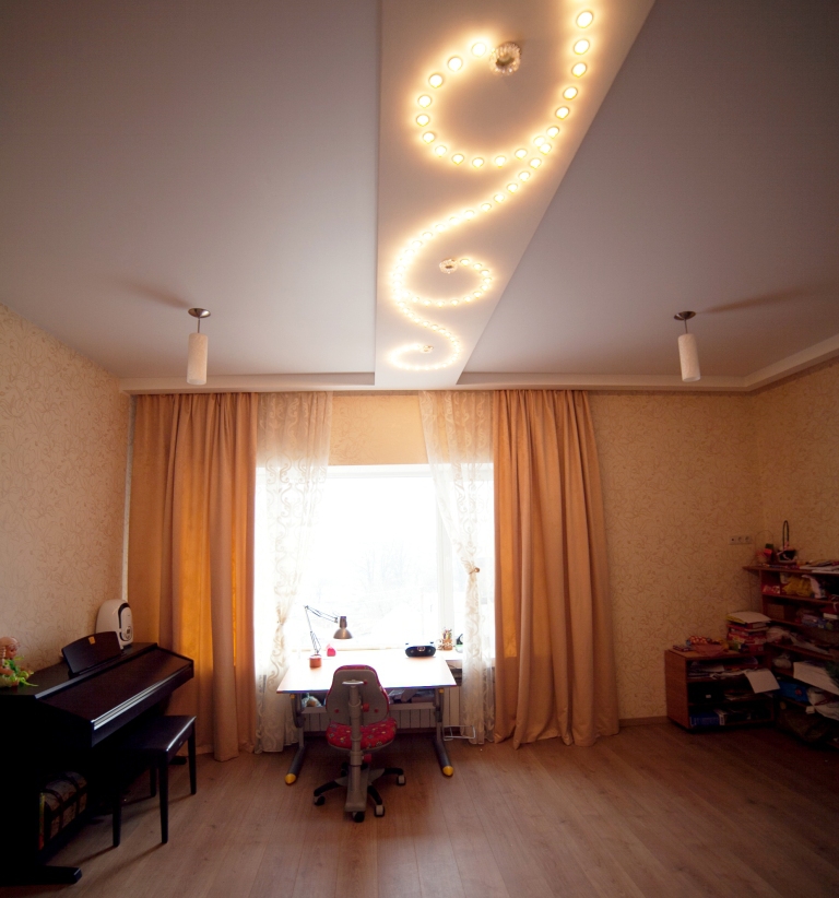 Поскольку обычные лампы накаливания сильно нагреваются, их нельзя устанавливать вместе с натяжными полотнами. С такими конструкциями можно использовать приглушенную систему освещения с регулировкой яркости. В этом случае отлично подойдут светодиодные ленты, точечные светильники, люминисцентные лампы. С их помощью вы получите не только мягкое освещение, но и интересные эффекты.