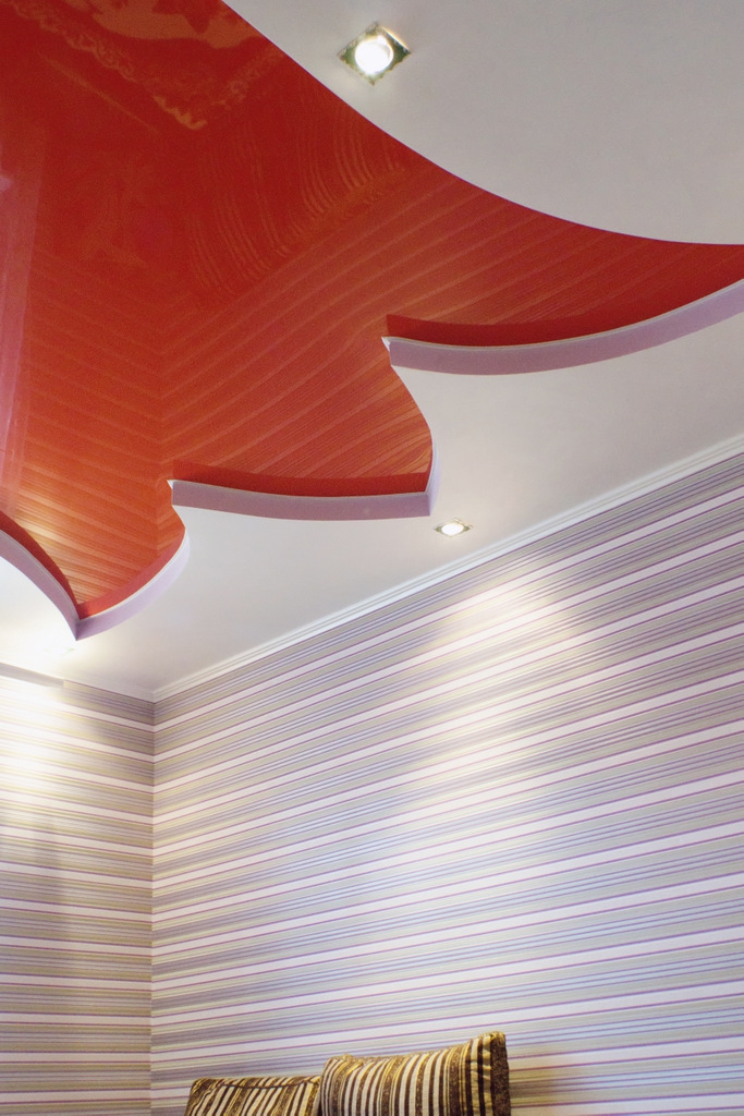 Многоуровневый потолок представляет собой конструкцию из нескольких полотен, установленных на разных высотах. Он смотрится эстетично и нестандартно, преображая пространство.