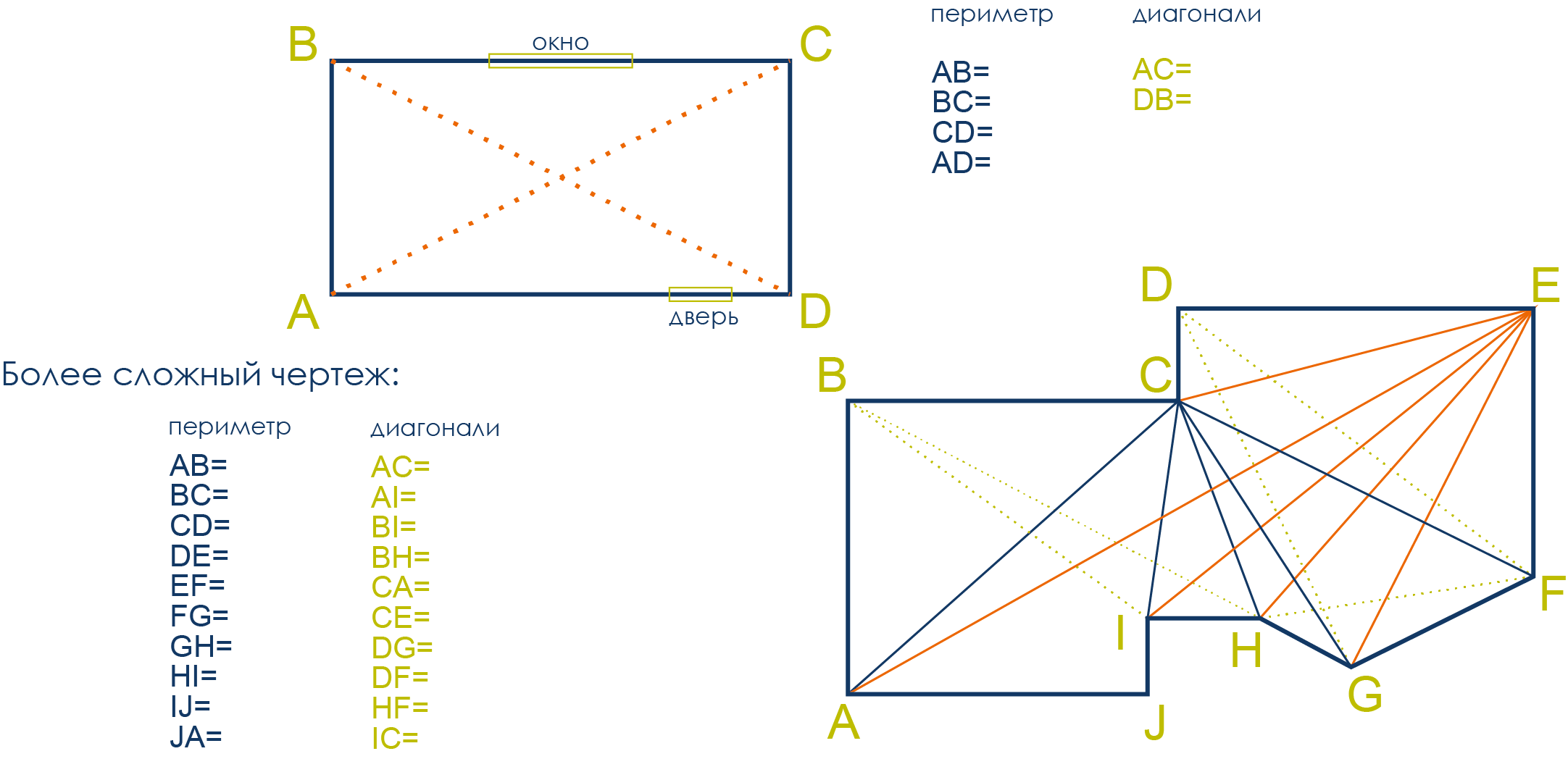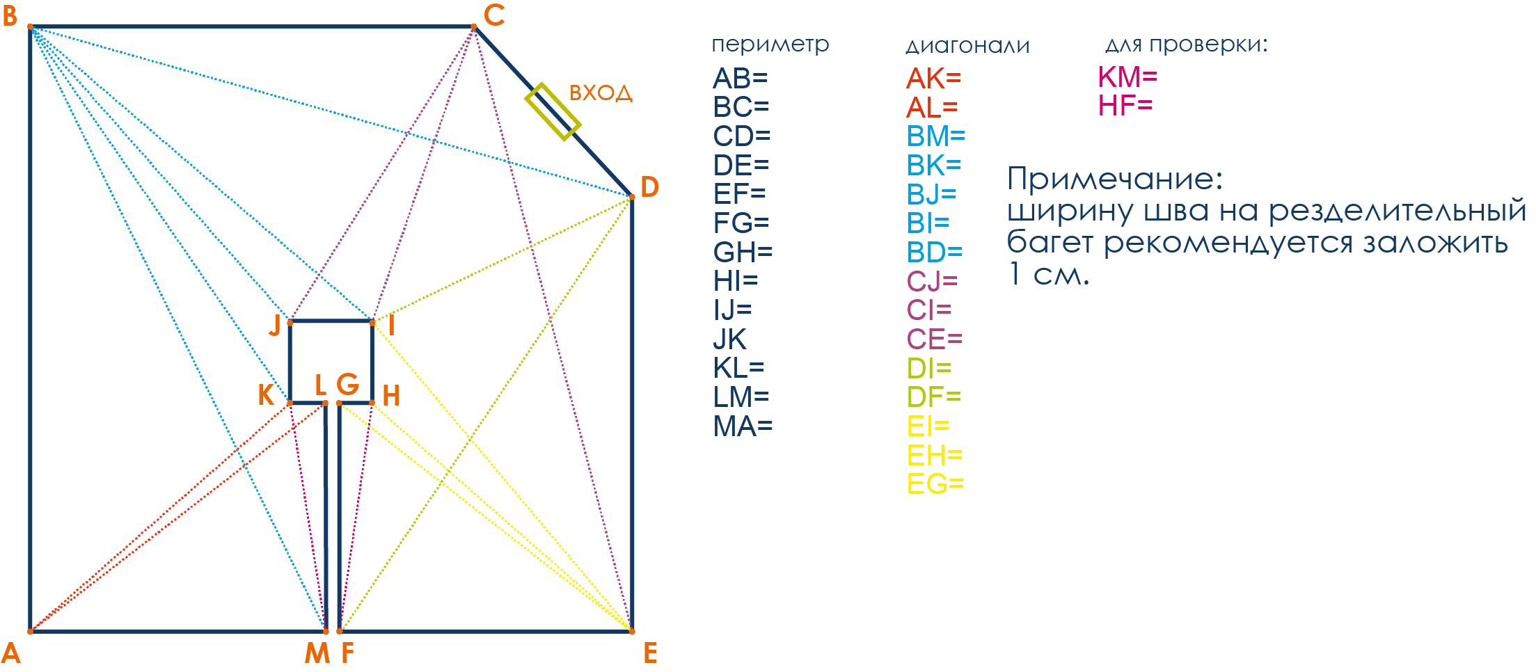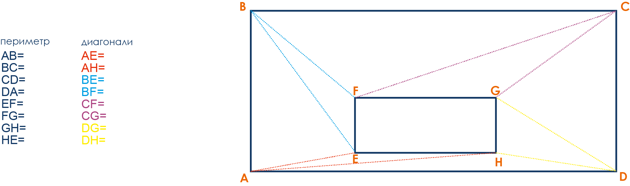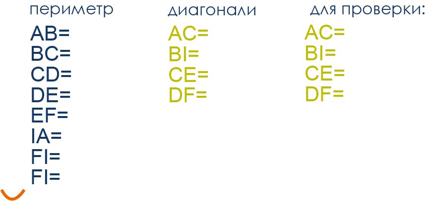Такой способ поможет ничего не забыть. При этом лучше визуально отделить замеры расстояний между точками периметра от диагоналей.