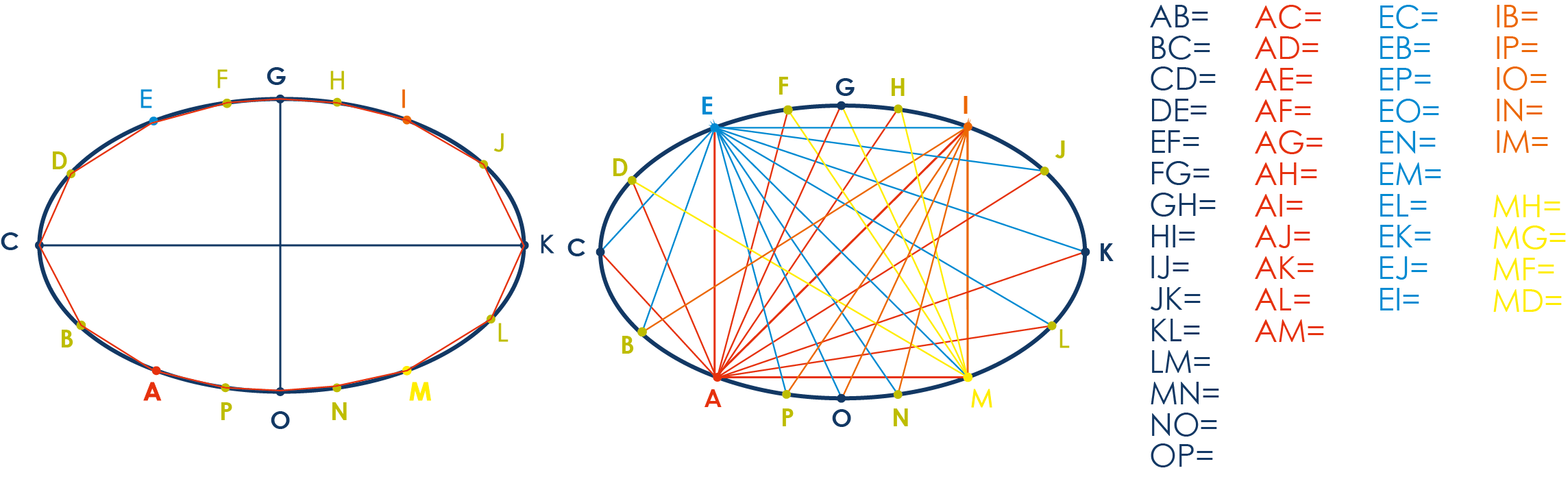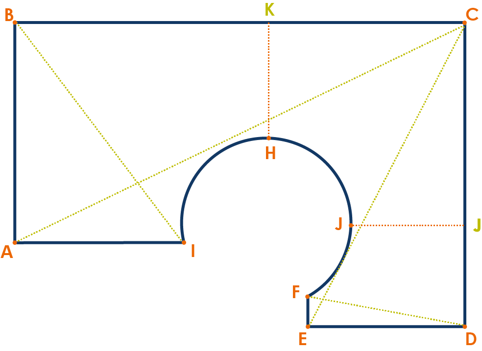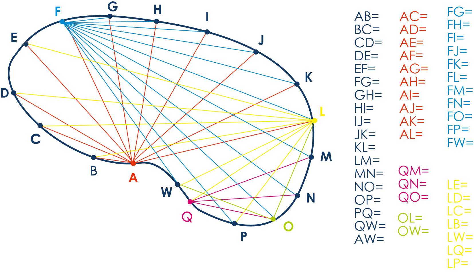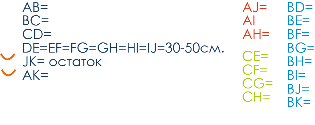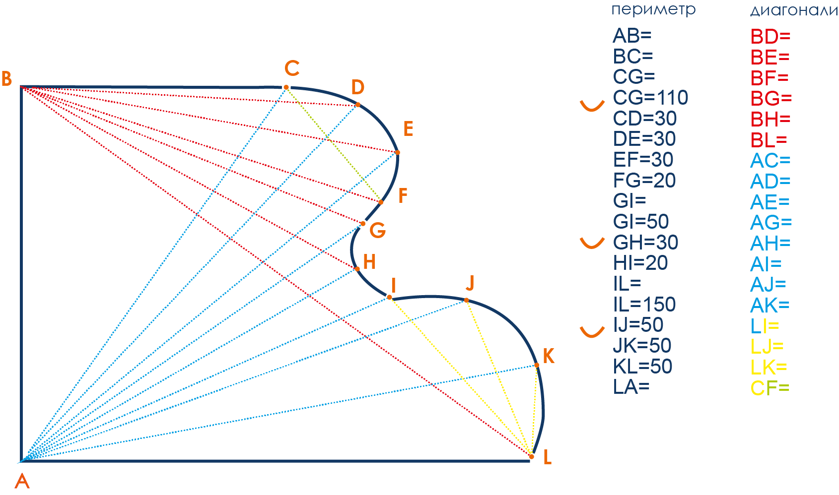 Такой способ поможет ничего не забыть. При этом лучше визуально отделить замеры расстояний между точками периметра от диагоналей.