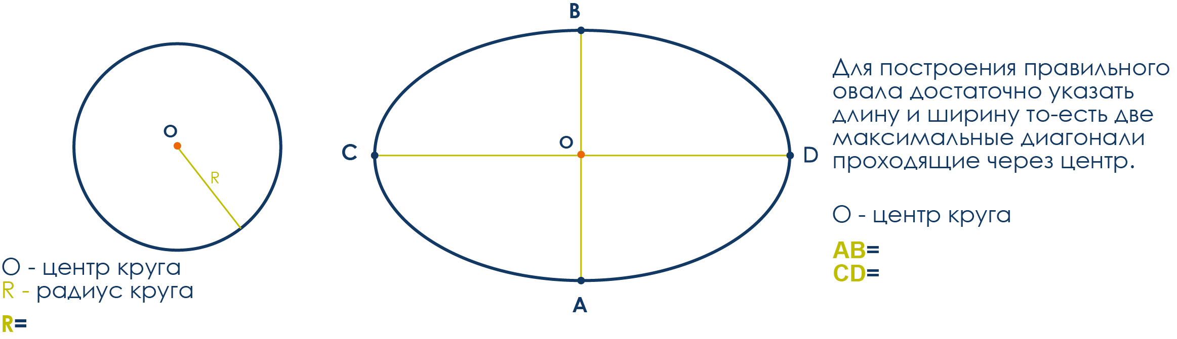 Для помещений в которых необходимо установить натяжной потолок в форме круга достаточно знать радиус круга. Для построения же более сложных фигур типа эллипса, овала, капли и т.д. необходимы следующие замеры: