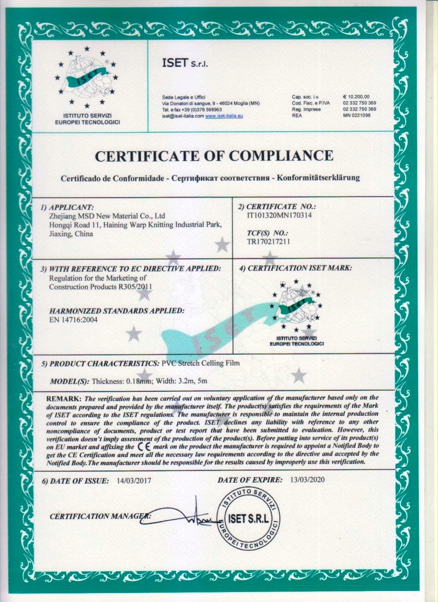Компания MSD по производству пленок для натяжных потолков в марте 2017 года получила сертификат качества материалов от европейского рынка СЕ!