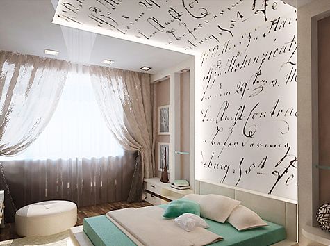 Оригинальность и свежесть всему интерьеру могут придать натяжные потолки, оформленные с какой-нибудь изюминкой. Например, интересной деталью станет фактура. Если вы хотите создать эффект окрашенного потолка, закажите матовое полотно. Если стоит задача показать шлифованную поверхность, выбирайте сатиновое покрытие.