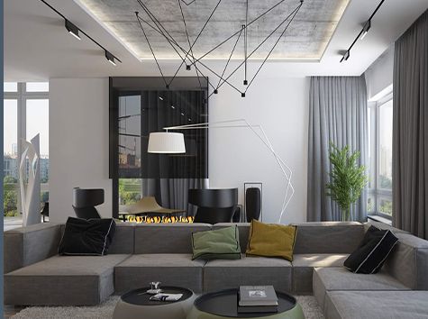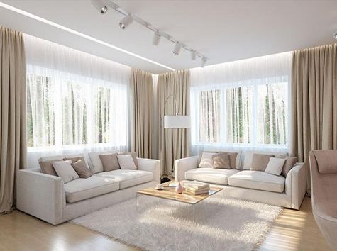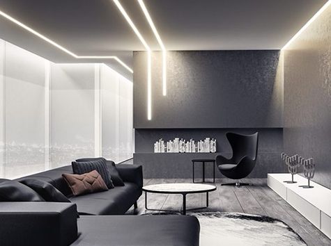Чтобы еще больше привлечь внимание к натяжному потолку, установите необычное освещение. Это может быть линейная или сплошная подсветка по всей плоскости полотна, светильники в нишах, встроенные трековые системы, скрытые карнизы с подсветкой штор.