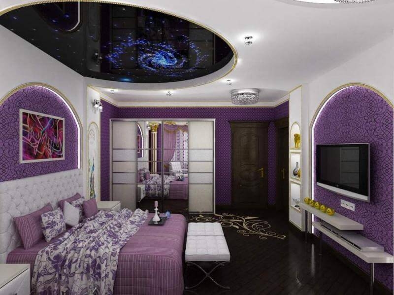 Что касается рисунков на потолках в стиле авангард, то они практически не используются. На них чаще можно увидеть несколько контрастных оттенков, что получается путем комбинирования разных по цвету натяжных полотен.