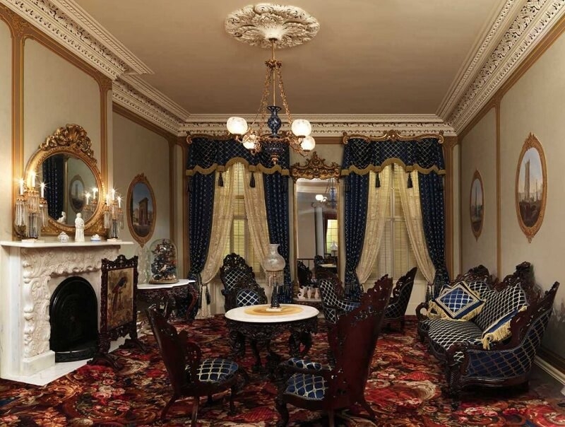 Для этого старинного стиля характерны богатые и тяжелые ткани. Главное, на что следует ориентироваться при их выборе для штор, обивки подушек, покрывал - это высокая плотность. Например, бархат или парча идеально подойдут для массивных штор длиной на всю высоту окна.