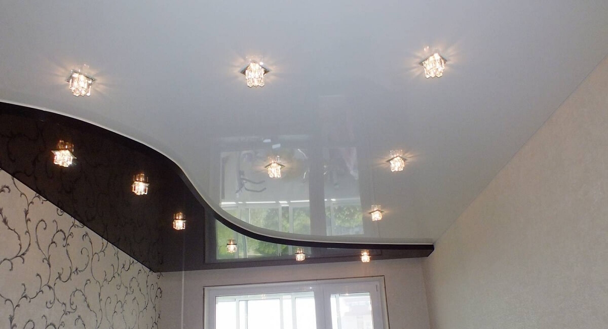 Для создания модного стиля хай-тек хорошо подойдут натяжные потолки с прямолинейной спайкой разных по цвету полотен.