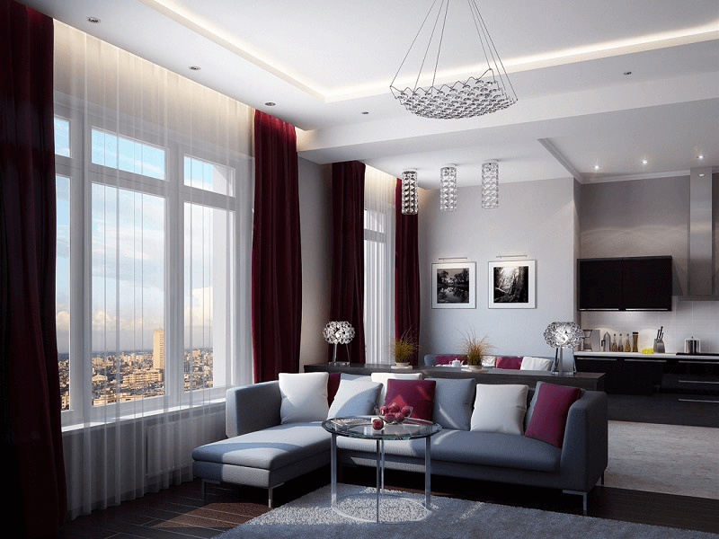 Цвет натяжного потолка может подбираться под основной, например, белый или под элементы декора, то есть в контраст может быть ярким красным, черным и т.д