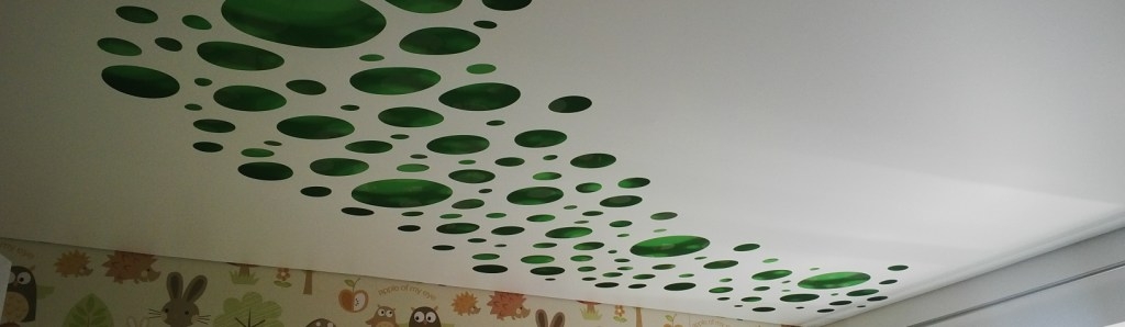 Така натяжна стеля часто буває яскравого кольору, глянцевої фактури. Може бути зроблена зі спайки декількох кольорів і фактур.